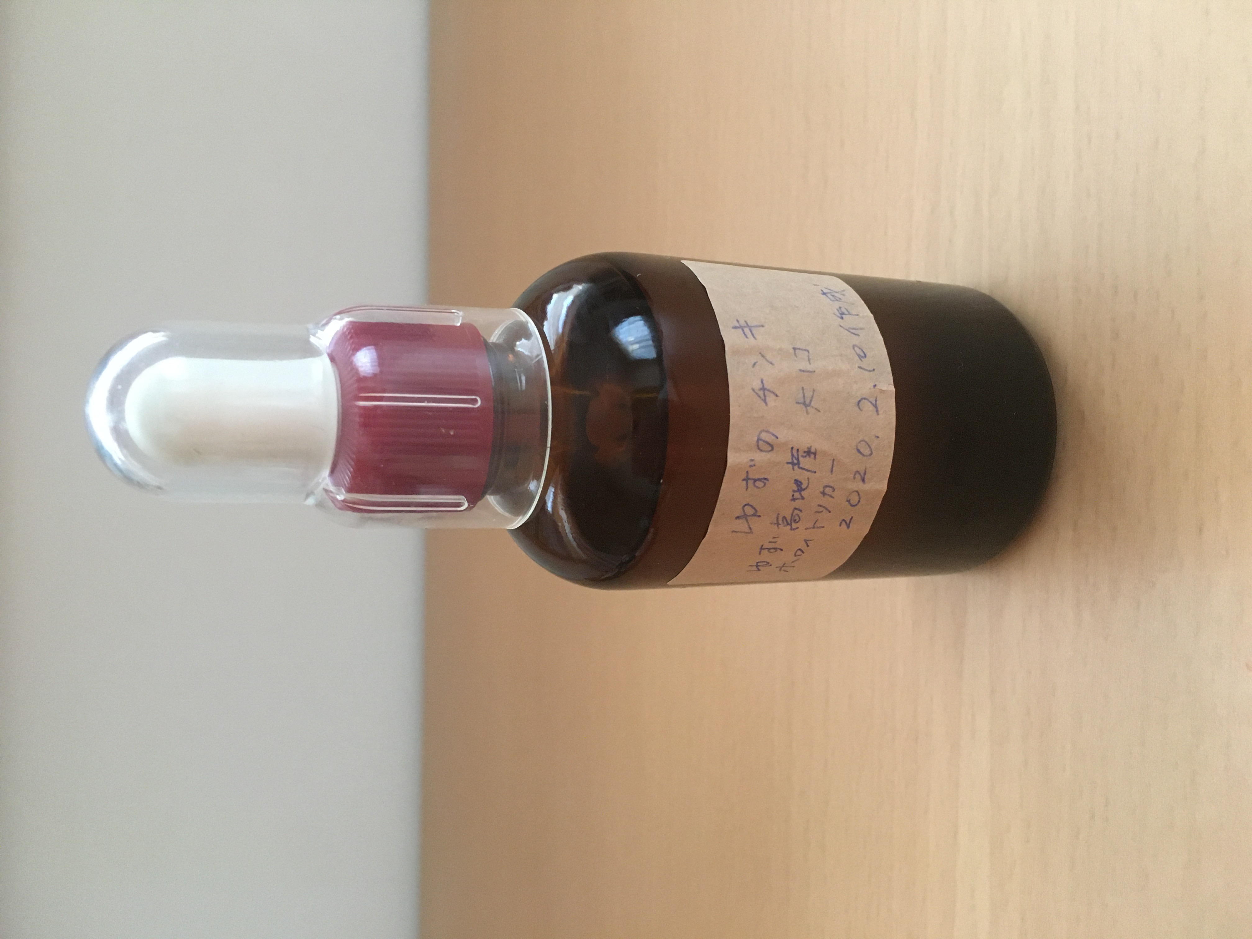 6. 遮光保存瓶に絞ったチンキを入れ、作成日をラベルに書いて貼っておきましょう。 完成!